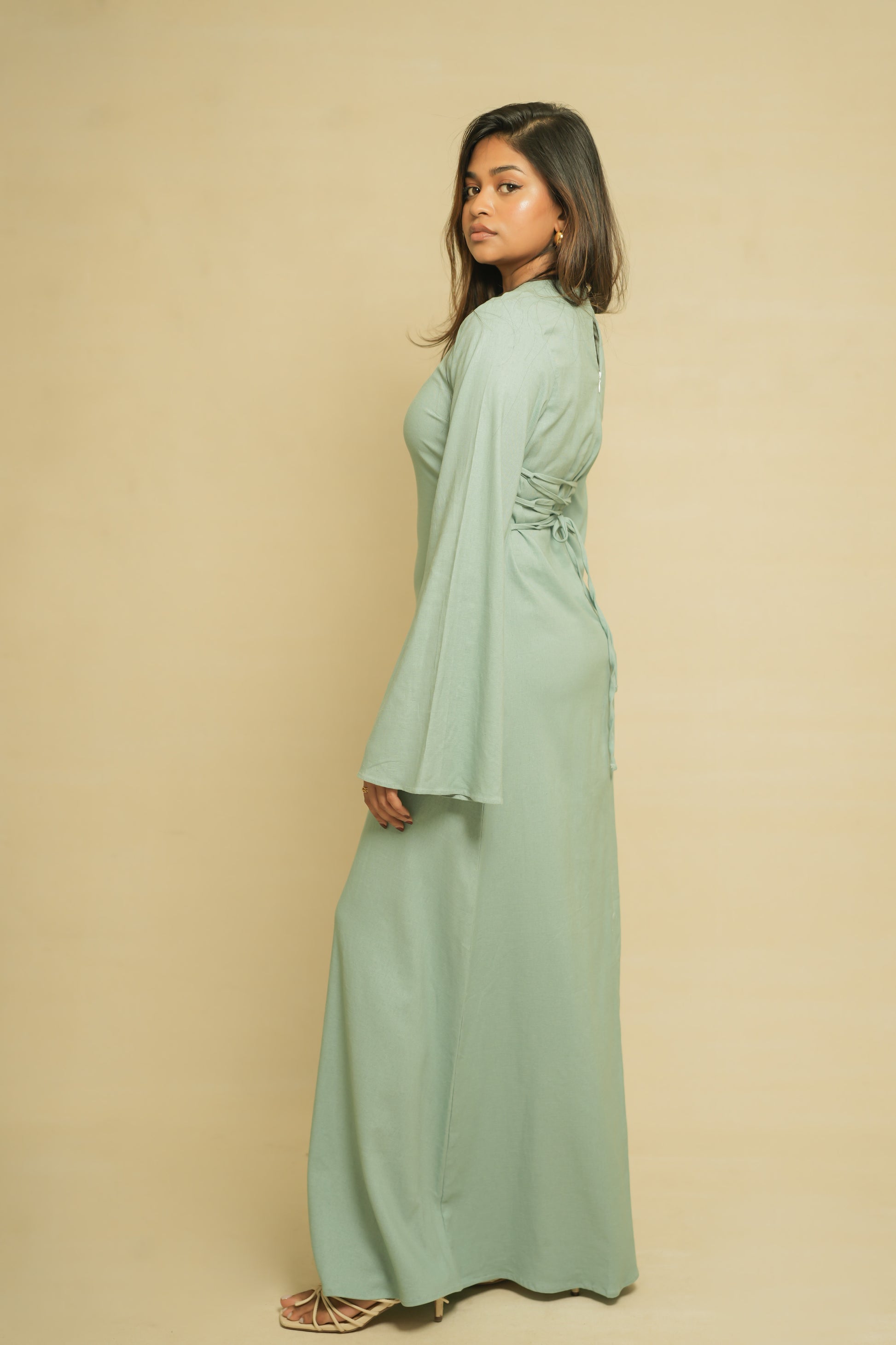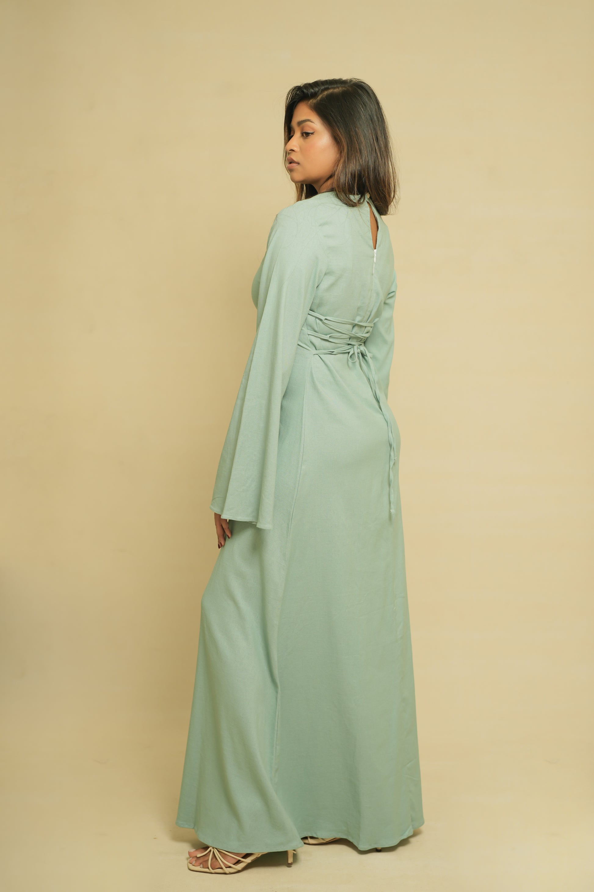The Airi Sleeved Maxi features a high neck, long bell sleeves, and loops at the back to tie and cinch the waist, offering a graceful and flattering fit in a floor-length silhouette.